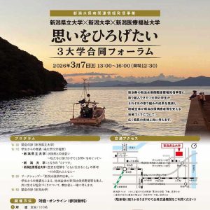 新潟県立大学、新潟大学、新潟医療福祉大学が取り組んでいる新潟県の「令和7年度 新潟水俣病関連情報発信事業」。 この事業を通して各大学の学生が学んだ成果を発表する「3大学合同フォーラム」が、2026年3月7日(土)に開 …