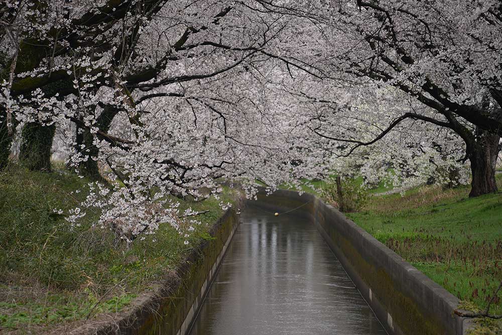 新江用水路の両岸約4.6キロメートルにわたって500本のソメイヨシノが咲き誇ります。この桜は昭和55年に旧安田町の町制20周年を記念して町民の手で植えられたものです。春には桜の木の下を散歩する人々や花見客にやすらぎを与えてくれます。