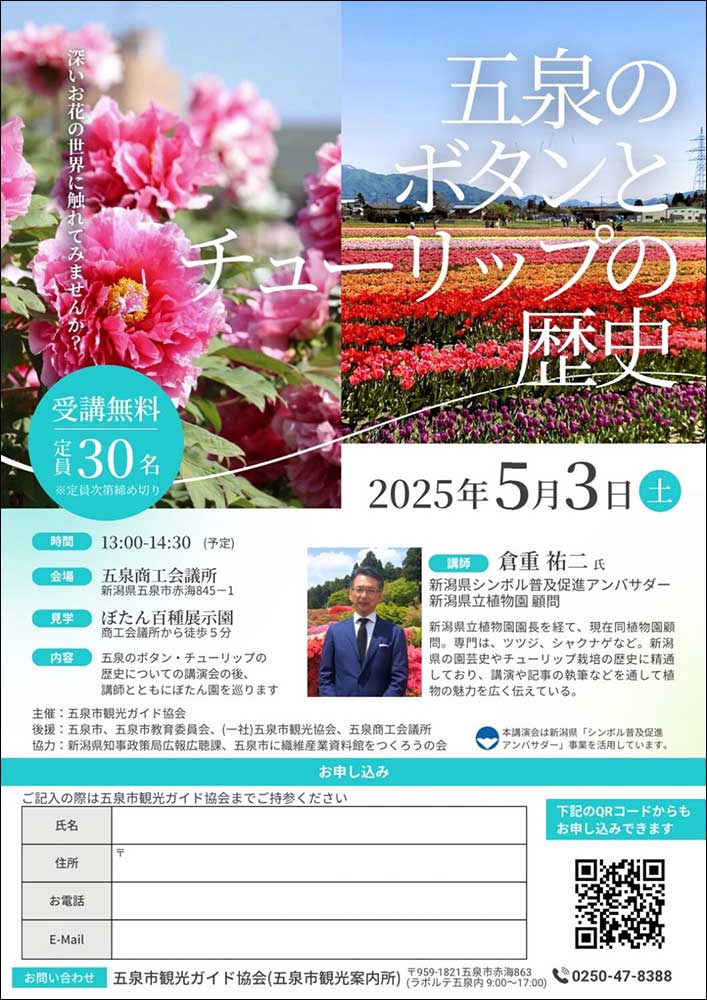 2025年5月3日(日)、五泉市の五泉商工会議所を会場に、「五泉のボタンとチューリップの歴史」講座が開催されます!