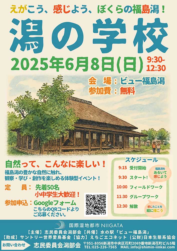 2025年6月8日(日)、新潟市北区の「ビュー福島潟」を会場に、「潟の学校~えがこう、感じよう、ぼくらの福島潟!~」が開催されます!