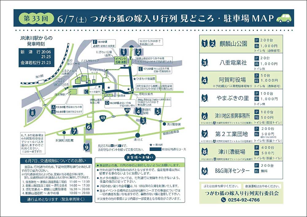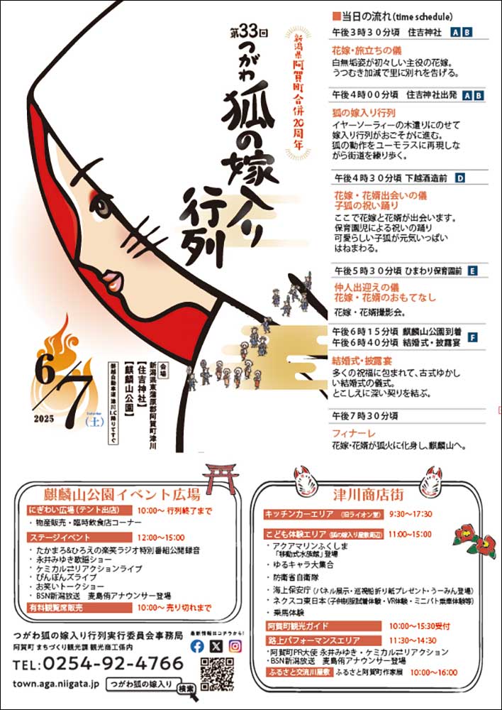 ※天候その他の事情により内容が一部変更となる場合がございます - お問合せ:阿賀町まちづくり観光課内「つがわ狐の嫁入り行列実行委員会 事務局」(電話0254-92-4766)