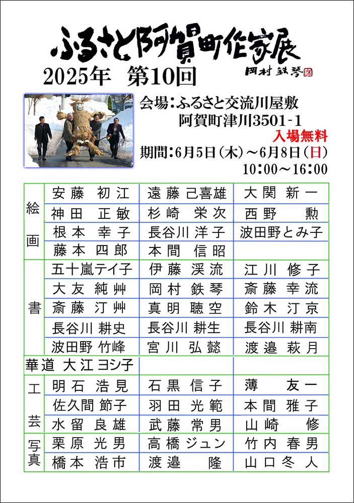 阿賀町津川の「ふるさと交流川屋敷(阿賀町公民館津川分館)」にて、「2025年 第10回ふるさと阿賀町作家展」が開催されます!