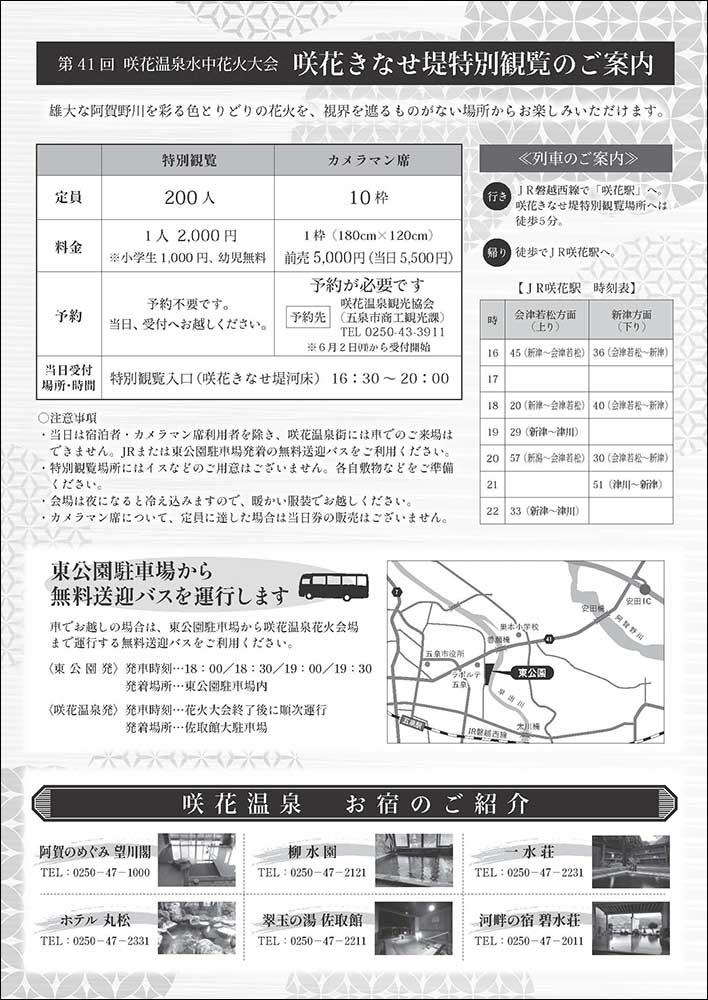 ※当日は宿泊者・カメラマン席利用者を除き、咲花温泉街には車でのご来場はできません。咲花温泉街への来場にはJRまたは東公園発着の無料送迎バスをご利用ください(詳細については、チラシや五泉市ホームページにてご確認ください)