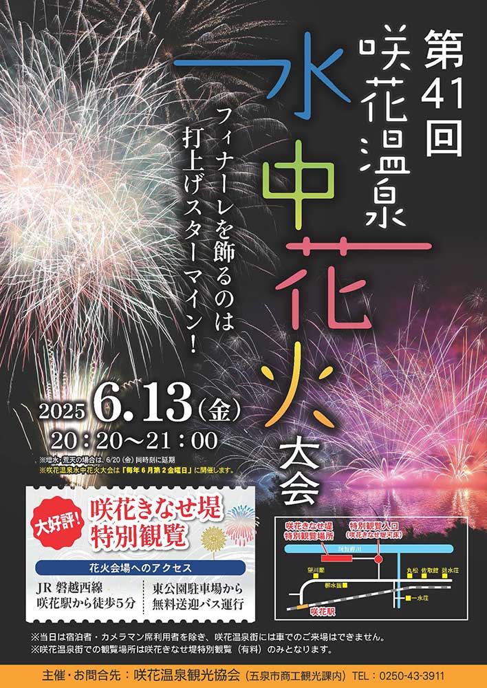 2025年6月13日(金)、五泉市にて「第41回 咲花温泉水中花火大会」が開催されます♪(※増水・荒天の場合は6月20日(金)に延期)