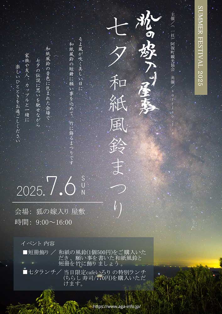 2025年7月6日(日)に、阿賀町津川の「狐の嫁入り屋敷」を会場に、「七夕和紙風鈴まつり」が開催されます!