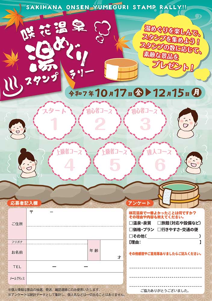 スタンプは2個から応募できて、スタンプの数の応じて景品が異なります★特に初心者コース(スタンプ2~3個)の景品「お好きな旅館の日帰り入浴」は先着順とのことですので、どうぞお早めに!(達人コース〔スタンプ6個〕・上級者コース〔スタンプ4~5個〕は応募締切後に抽選)