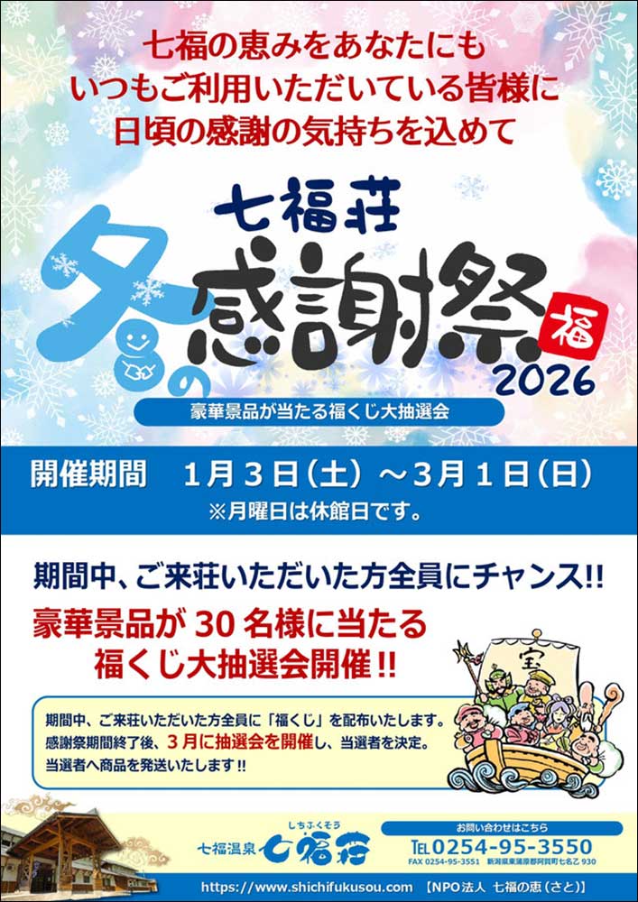 【開催期間2026.1/3~3/1まで】阿賀町・七福温泉 七福荘 冬の感謝祭2026~豪華景品が当たる福くじ~