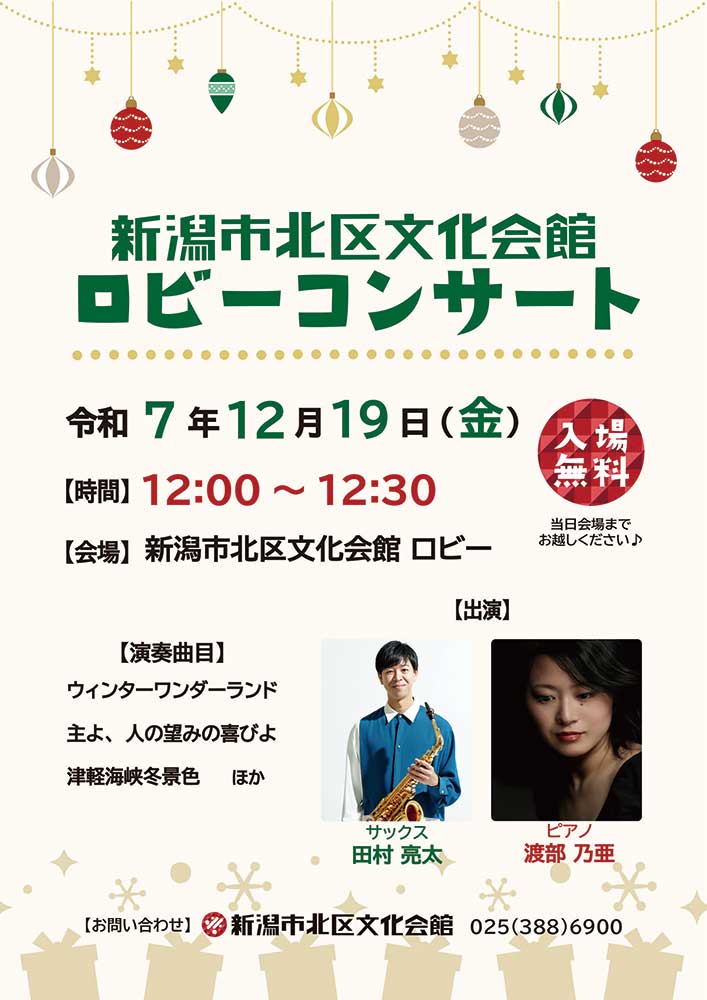 2025年12月19日(金)お昼12時~12時30分まで、新潟市北区文化会館にて、「新潟市北区文化会館ロビーコンサート」が開催されます♪