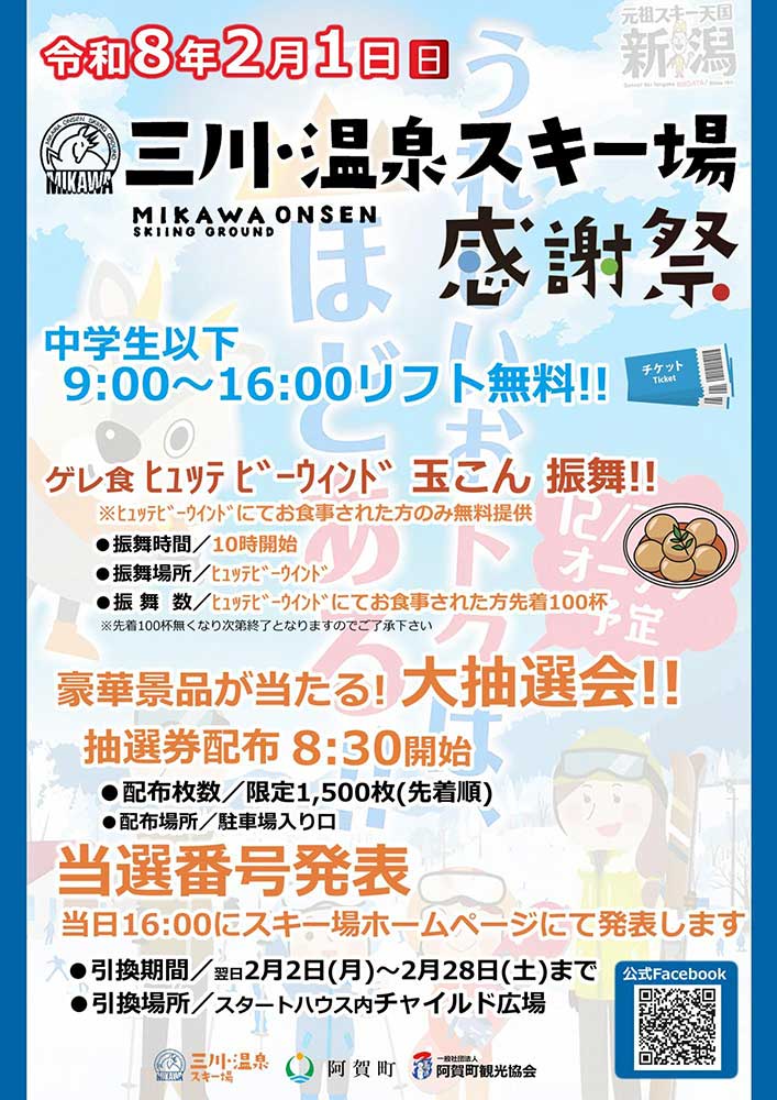 阿賀町の「三川・温泉スキー場」では、2026年2月1日(日)に「三川・温泉スキー場 感謝祭」が開催されます!