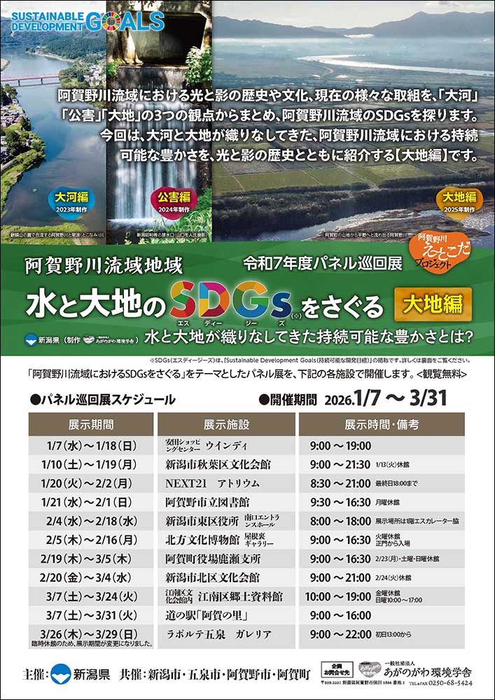 「阿賀野川流域におけるSDGsをさぐる」をテーマとしたパネル展を、令和8年1月7日から3月31日まで、阿賀野川流域の各施設で開催します! 観覧無料ですので、お近くの会場にぜひお出かけください!