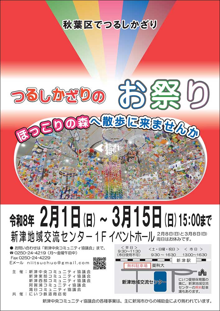 ご案内が遅くなってしまいましたが、2026年3月15日(日)まで、新潟市秋葉区の新津地域交流センター1階ホールでは、保育園や小中学校、福祉施設やコミュニティ協議会など、秋葉区の皆さんが折り紙で作った「つるし飾り」が飾られています!