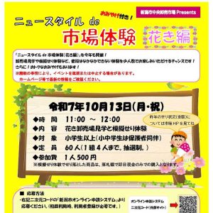 (続きを読む・・・)(新潟市ホームページより引用) 「ニュースタイルde市場体験(花き編)」を開催します。 こちらのイベントは、普段はなかなかできない卸売場見学や模擬せり体験等、少人数でより深く市場を体験することができるチャンスです! …