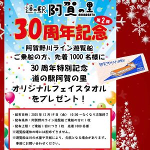 (道の駅「阿賀の里」ホームページより引用) 阿賀町の道の駅「阿賀の里」では、「30周年記念 第2弾イベント」が開催されています! 内容は、阿賀野川ライン遊覧船に乗船した先着1,000名様に、「30周年特別記念」道の駅 …
